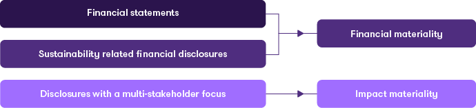 The CSRD and ESRS introduce the concept of double materiality. Entities applying ESRS must report material impacts, risks and opportunities or 'IROs' across each topical area within their sustainability statements that are both financially impactful (outside in) and have an impact to people and the environment (inside out).